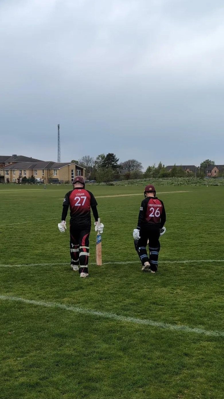 Cruickshank and Logan strode out together with vastly different lengths of stride, and of innings too, Logan sent back after scoring seven. The long levers of the Flymo/Sean Dyche lookalike/soon to be father of two Blades out to the middle next. Another short innings but all that comes with supporting a young family, a lack of availability to train, and an expectant wife all familiar foes to ESCA Division 3 optimal performance. I’ve heard that there are certain pubs that help improve performance….
